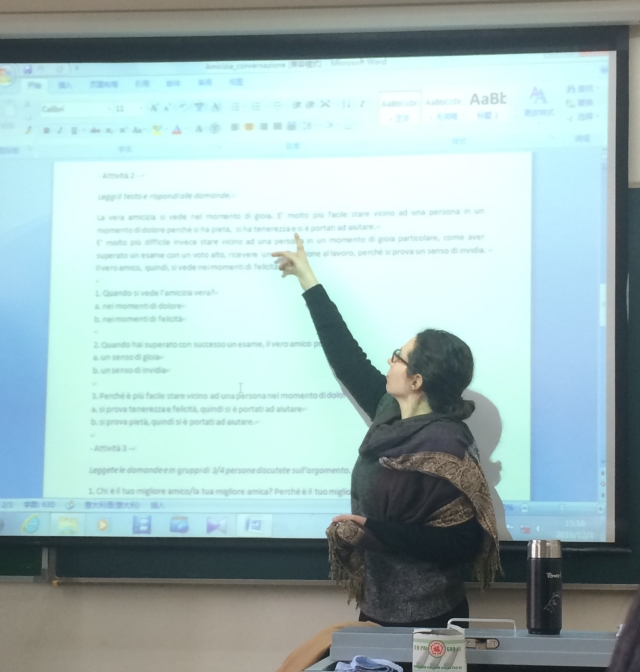 “和印象里的意大利人一样,她小小的脸,高高的个子,黄头发,白皮肤。记得第一堂课就是让我们写单词,我当时觉得,这位老师应该是没教过课吧?我总觉得有股一二年级的小朋友写拼音的感觉。然而专业课老师说,她其实是想了解我们对词汇的掌握程度的时候,小小的惊讶。后来,她自己制作教学用的材料,大部分设计的词汇都在我们学习范围内的时候,我很钦佩,她能用这么短的时间融入我们。