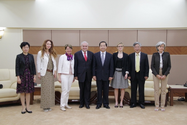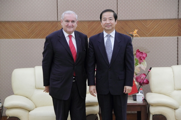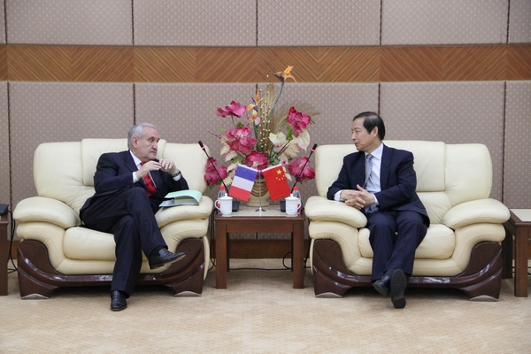 上午9点半,曹德明校长携校对外合作交流处处长张红玲教授及法语系主任肖云上教授,在图文贵宾厅接待了拉法兰先生一行。曹校长向拉法兰先生介绍了我校的学科构成、教学科研以及对外交流等情况,拉法兰先生对我校的法语教学和中法交流颇为关注,并就中国人学法语、法国人学中文的情况与曹校长进行了探讨。