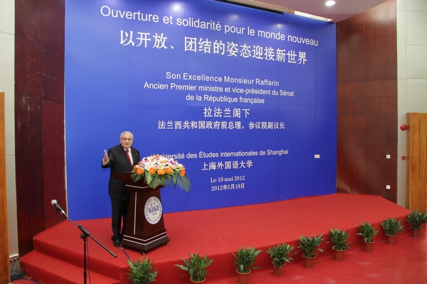 2012年5月18日,法国前总理、参议院副议长让-皮埃尔•拉法兰先生携夫人一行在法国驻沪总领馆代表的陪同下,访问了我校松江校区,并为法语系师生作了一场“以开放、团结的姿态迎接新世界”为题的精彩演讲。