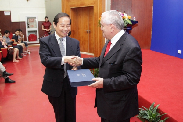 其次,他对备受瞩目的中欧关系、德法关系以及中法关系发展趋势进行了剖析。回顾几十年来访华所得,他见证了中国的腾飞,对中国在世界上扮演的重要角色加以肯定。欧洲在面对增长缓慢、货币和债务三重危机时,作为欧盟核心的德法两国之间势必进行磋商,在紧缩政策和促进增长之间寻找到平衡。而中国作为亚洲大国和许多国际组织的成员,既是世界银行家、又是经济发动机,德法有必要紧密合作,领导欧盟与中国进行多元化、多层次的合作。中法德三国之间已经形成了一个牢固的三角体系,在政治、经济等方面各有侧重。中欧之间的思想文化交流也是开放与团结的重点,拉法兰先生生动精辟地将欧洲的辩证法思维方式和中国的阴阳观思维方式进行了对比,指出了中国思维方式的先进性。拉法兰借此激励在座学生在学习中发挥语言特长,吸收中欧思想精髓,以语言为桥梁进行文化沟通,希望大家不仅要成为经济交流的使者,更要担负起文化交流的重任,在各个领域大展身手。