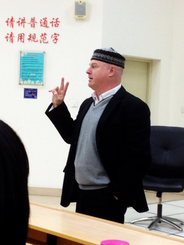 初见Kolter其实是在高三毕业那个暑假,我在还没来上外的时候便加入了网上的新生群,有一次群里突然出现了一个外国中年人的照片,他带着一顶小圆帽眯着眼睛面带微笑,右手摆出“V”。如此可爱的动作与他略胖的身材形成了鲜明的对比,着实可爱。我当时心里就在暗暗地想这个外教绝对是一个老顽童!可是当我第一次上Kolter课的时候却让我着实意外,还以为“老顽童”是永远正经严肃不起来的,没想到Kolter的第一堂课就给了我们一个“下马威”。