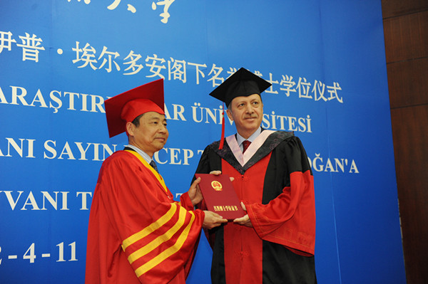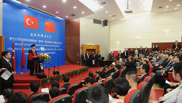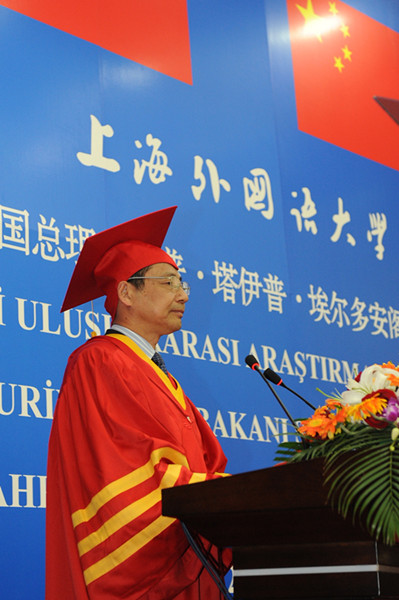 曹德明代表上外宣布,经上外学术委员会推荐,中国国务院学位办公室批准,决定授予埃尔多安总理阁下上海外国语大学名誉博士学位。
