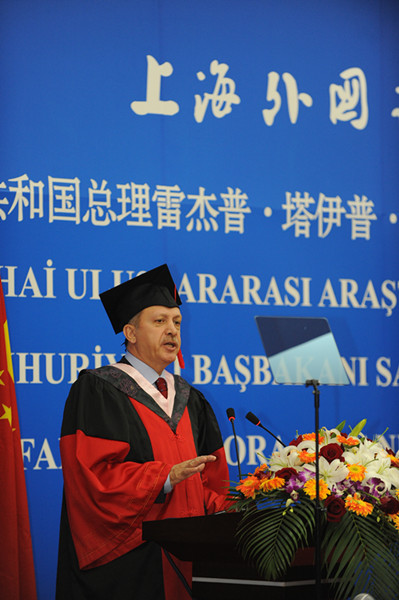 季春时节,上海外国语大学校园绿树成荫,鲜花簇拥,春光明媚。4月11日下午,拥有60多年历史的上海外国语大学迎来了一位尊贵的客人——土耳其总理雷杰普·塔伊普·埃尔多安。在上外松江校区图文信息大楼西报告厅,埃尔多安总理发表了演讲,随后出席了上外与土耳其尤努斯·艾姆莱研究院合作协议签约仪式,并为上外土耳其语专业揭牌。