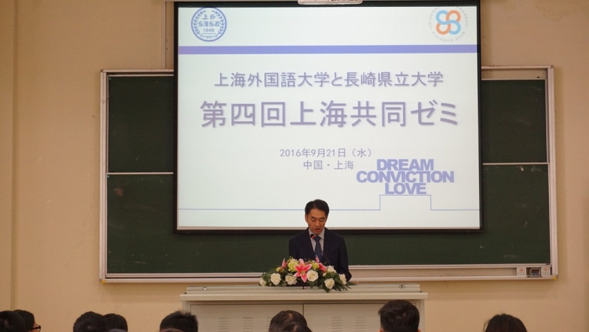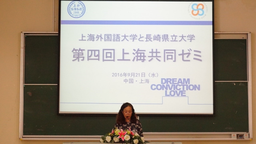 9月21日上午,由上海外国语大学日本文化经济学院与校际交流校日本长崎县立大学共同主办的2016年度“上海研讨会”在上海外国语大学松江校区八教楼举行。该活动从2013年开始已成功举办3届,今年为第4届。在两校教师的组织带领下,日院50名大三本科生与远道而来的长崎县立大学24名学生就中日大学生的学习、课余生活、将来就业等感兴趣的话题进行了发表、讨论和交流。