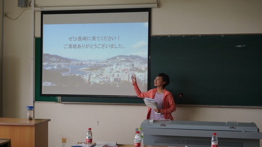 日院大三学生王子洛同学用日语分别介绍上外及学院的专业设置、师资力量、教学特色和课外活动情况。日方学生代表介绍了长崎县的人文特色和长崎县立大学的办学宗旨、专业设置及校园环境。通过介绍,双方学生对彼此的学校有了更深层次的了解和认识。