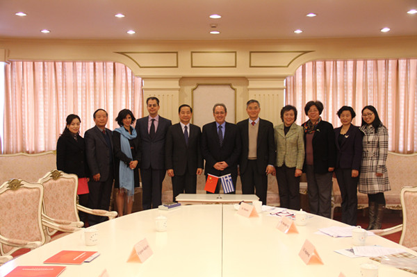 陪同米洛普洛斯校长参加会见的还有该校工程学院教授科洛吉萨女士、希腊驻上海总领事卡尔佩里斯先生。我校参加会见的有对外合作交流处处长张红玲教授,西方语系系主任陆经生教授,国际交流学院徐宝妹教授,以及希腊语教研室各位教师等。