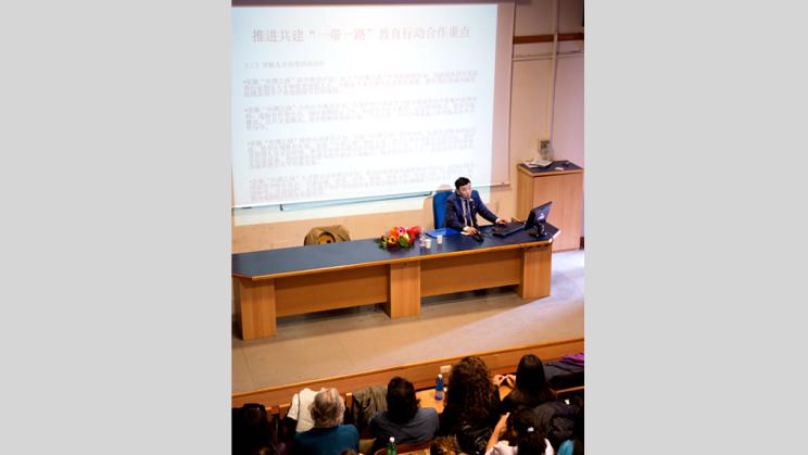 2017年4月28日上午11点,中国驻意大利大使馆教育参赞罗平先生应意大利那不勒斯东方大学校长Elda Morlicchio教授和孔子学院中方院长徐海铭教授的邀请,专门从罗马赶到东方大学和孔子学院,给200多名意大利师生做了一场题为《推动共建丝绸之路经济带和21世纪海上丝绸之路的愿景和行动》的学术报告。报告引起聆听师生积极正面而又友好亲和的反响,大大激发了意大利学生对华的热情和兴趣。