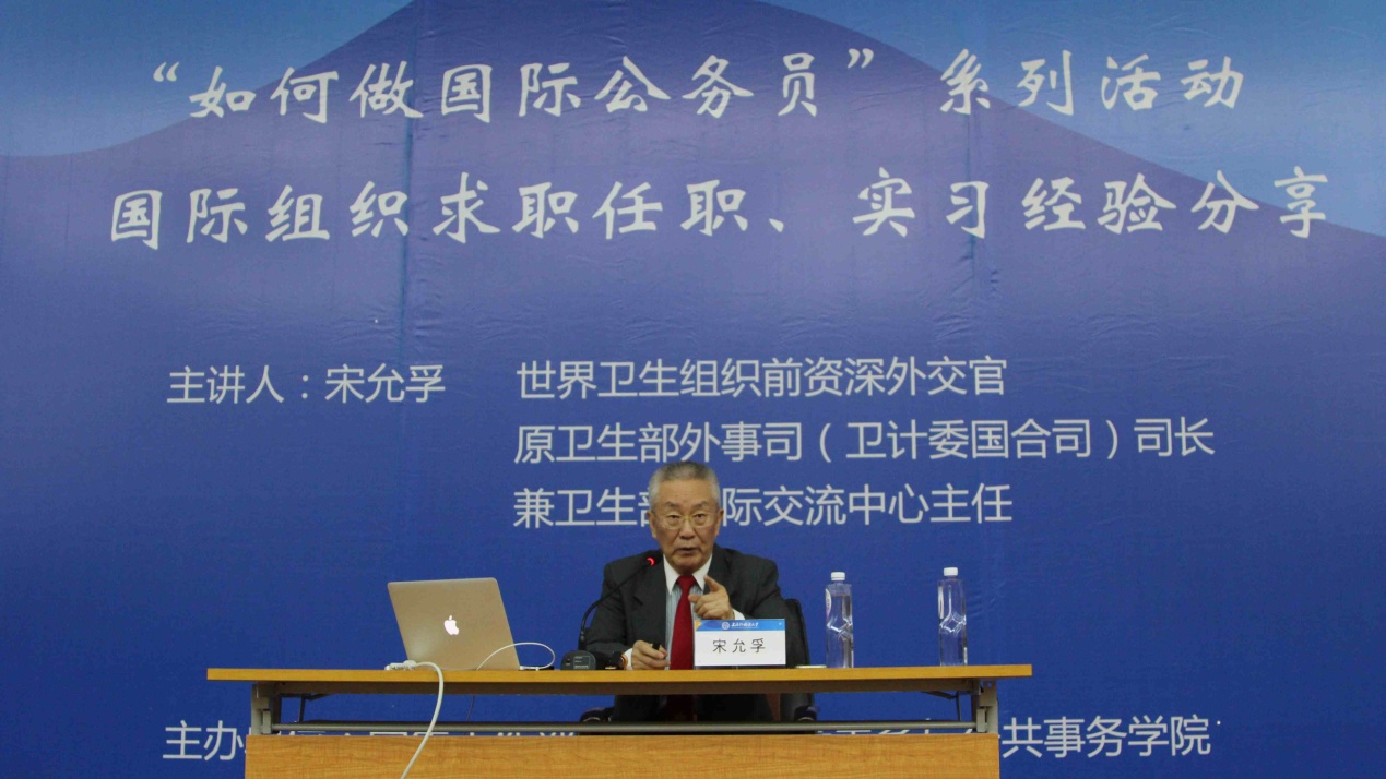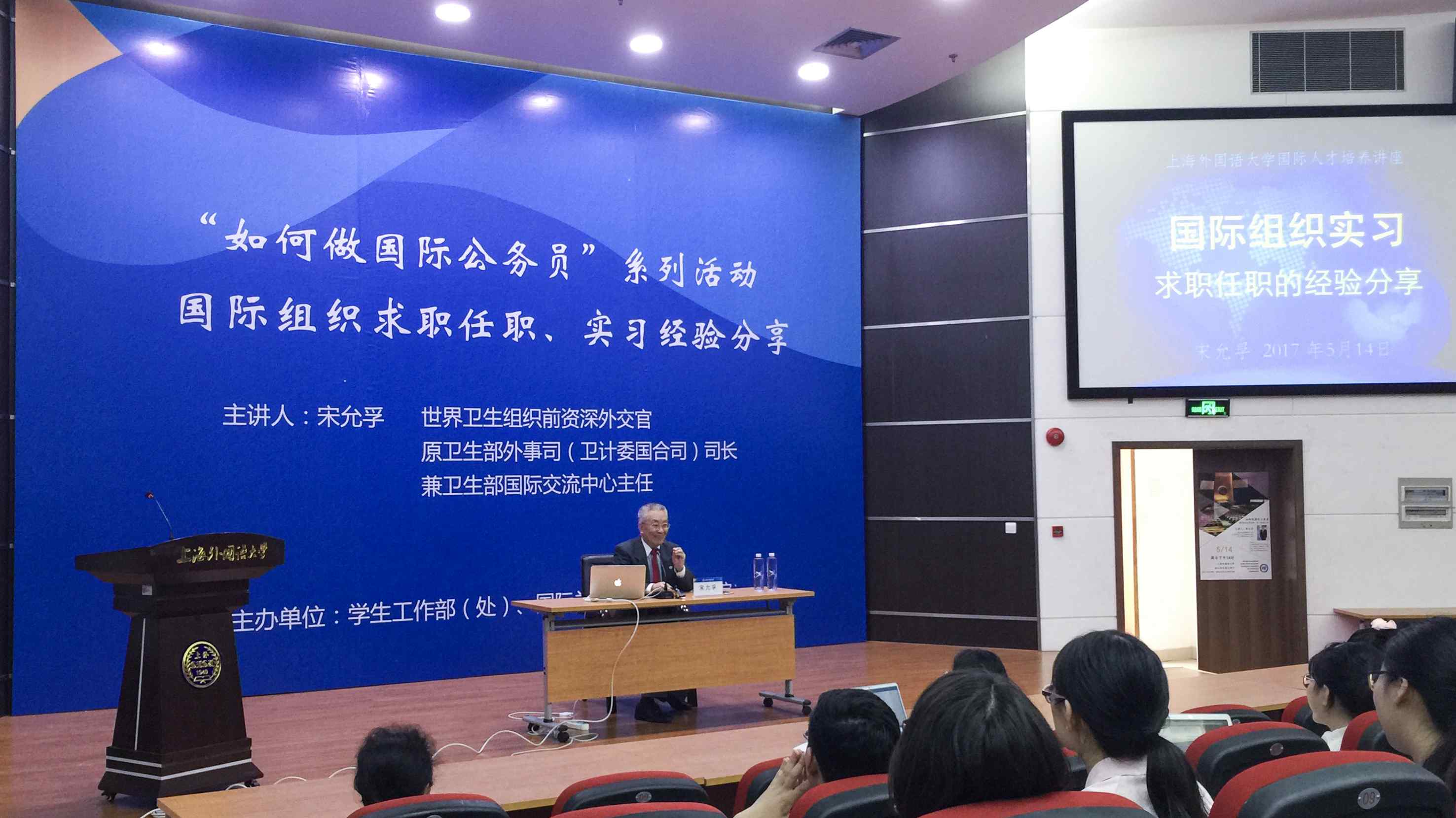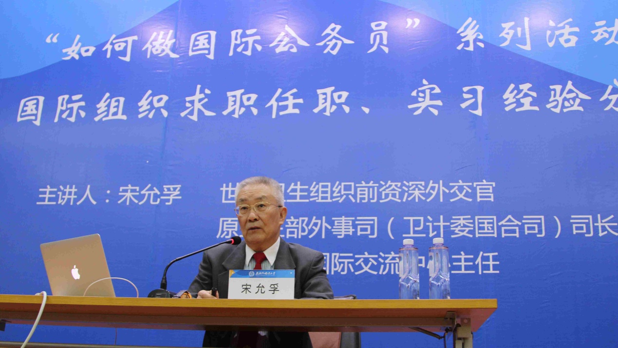 5月14日下午,世界卫生组织前资深外交官、原卫生部外事司(卫计委国合司)司长、兼卫生部国际交流中心主任宋允孚在上海外国语大学松江校区图文信息中心西厅为全校师生带来题为“如何做国际公务员——国际组织求职任职、实习经验分享”的讲座。