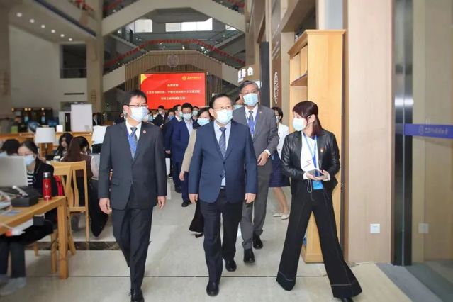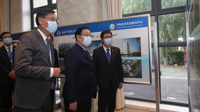 万钢主席一行首先参观了中阿改革发展研究中心。作为由国家主席习近平亲自倡议成立的新型高端智库,中心致力于为中阿双方交流改革发展和治国理政经验搭建平台。万钢主席听取了中心近年来的建设成果,关切地询问了中心与阿拉伯国家开展科研、交流合作的情况,期待中心为构建中阿命运共同体提供更多智力支持。