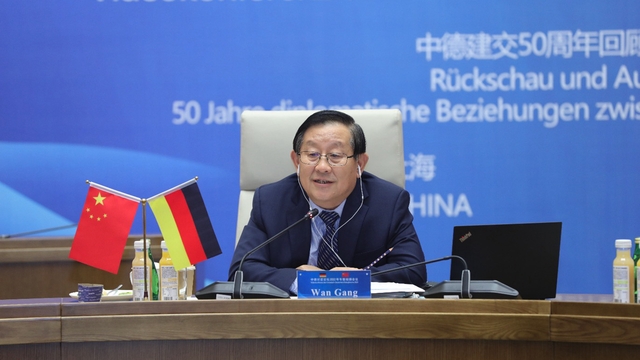 万钢在致辞中表示,中德建交50年来,双方坚持相互尊重、求同存异、平等互利,实现了共同发展、合作共赢,两国关系不断向前发展。希望今后继续增强政治互信、加强互利合作、增进民心相通,创造更加美好的未来。