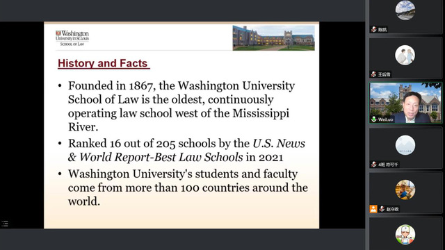 会谈后,罗伟主任在线为法学院本硕学生作了“英语法律文献检索—兼谈美国法学院的申请”的讲座,并与学生就参与圣路易斯华盛顿大学法学院合作项目的具体情况进行了交流。
