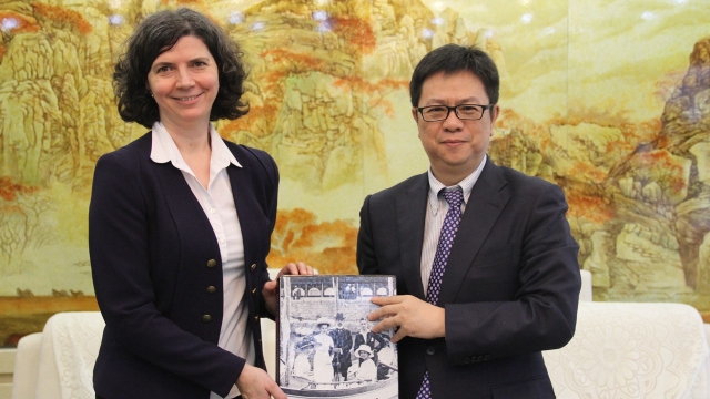 匈牙利外交与对外经济部对外匈语及教育司副司长Maroti Orsolya与国际教育关系处处长Hogenburg Tamas从匈牙利赴华参加此次学院成立大会,并为匈牙利语专业学生带来语言教学法、文化、历史、艺术史等各类匈语书籍及音像资料。Maroti Orsolya向校长李岩松赠书,李岩松对其为我校匈语教学提供的支持表达衷心感谢。