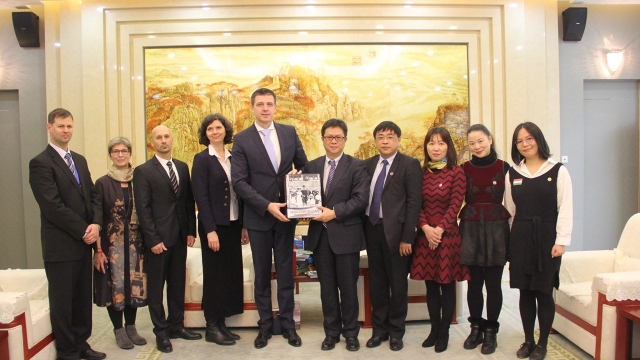 2017年12月15日上午,匈牙利驻上海总领馆总领事博岚Bolla Szilard、匈牙利外交与对外经济部对外匈语及教育司副司长Maroti Orsolya、国际教育关系处处长Hogenburg Tamas一行应邀来访上海外国语大学,参加我校俄罗斯东欧中亚学院成立大会。上海外国语大学校长李岩松在虹口校区会见匈方来宾,并与来宾亲切会谈。