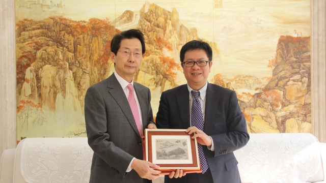 12月21日,韩国高等教育财团事务总长朴仁国一行四人来访上海外国语大学。李岩松校长在松江校区国际教育中心会见客人,并就深化双方学术合作、资助学者交流达成广泛共识。