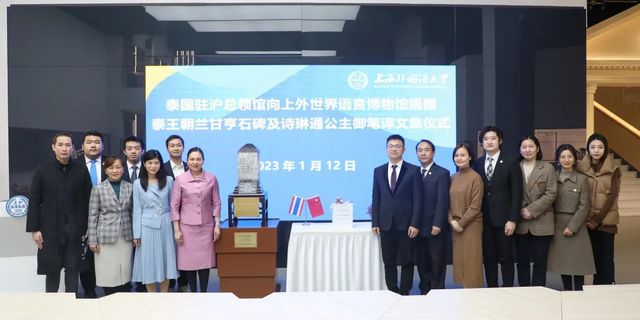 1月12日,泰国驻沪总领事乐达·普玛(Lada Phumas)一行6人访问上海外国语大学松江校区,向上外世界语言博物馆和东方语学院捐赠泰国素可泰王朝兰甘亨石碑复制品及《泰国诗琳通公主御笔文集及翻译文集》,上海外国语大学副校长衣永刚出席会见和捐赠仪式。