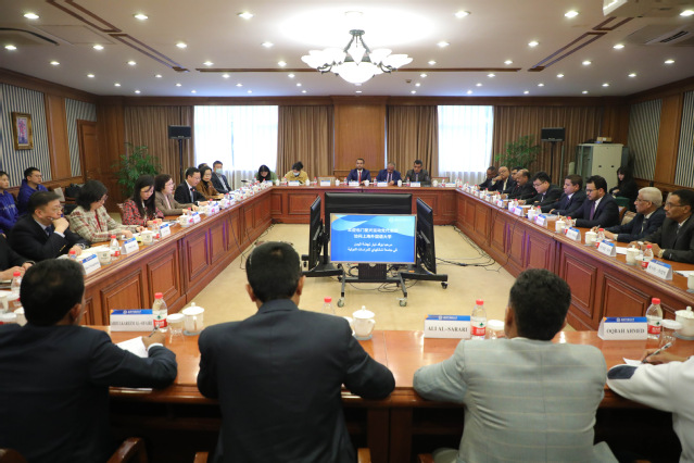 中阿改革发展研究中心执行主任王广大介绍了中心四大平台建设工作,回顾了也门官员参加中阿中心各类专题研修班的情况。东方语学院副院长陆怡玮介绍了上外阿拉伯语专业创建历史及该专业在学术研究、学生交流方面的情况,同时介绍了上外教育援建也门的历史。中东研究所丁俊所长就中东所作为教育部人文社科重点研究基地的发展历程、学术研究、期刊建设、人才培养及国际交流情况向来宾作了介绍。