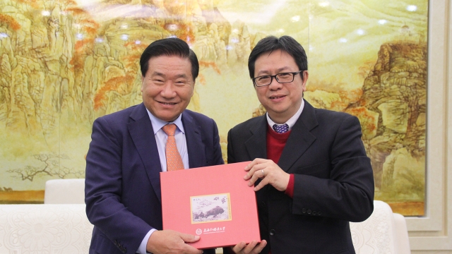 2018年1月11日,韩国SK集团前副会长、韩国高等教育财团创始人、前事务总长金在烈先生及北京SK幸福公益基金会秘书长田福熙先生一行来访我校。李岩松校长在虹口校区会见客人,并就深化双方学术合作交换意见。