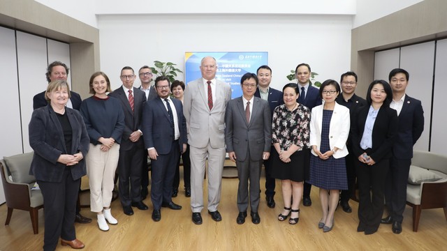 5月9日上午,新西兰—中国关系促进委员会(NZCC)主席、前驻华大使麦康年(John McKinnon)、怀卡托大学校长奎克力(Neil Quigley)教授、新西兰驻沪总领事鲍晓笛(Ardi Barnard)代表团一行访问上海外国语大学。校长李岩松在松江校区世界语言博物馆会见来宾。双方围绕深化和拓展上外与新西兰高等教育机构之间的教育和科研合作等话题进行了交流。