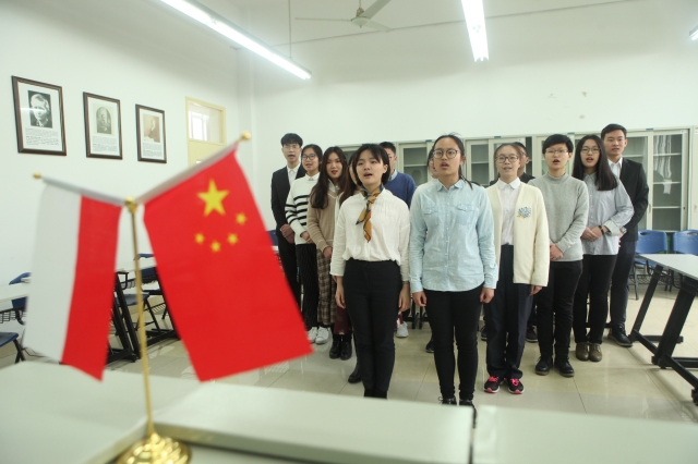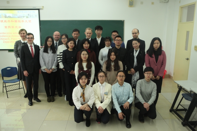 会谈之前大使一行先参观了俄欧亚学院,俄欧亚学院院长许宏、外事主管齐昕、中东欧系系主任钱琴与波兰语专业全体师生一起热烈欢迎赛熙军大使的到来。13名学生分别作了自我介绍,大使表示,很高兴能看到中国的青年选择了波兰语言文学专业。他谈到,在当今世界中,国与国之间、各国人民间的交往已不再因地理上相距遥远而受限,中波两国之间在各个领域的合作均不断加深。他相信,在不久的将来,波兰语专业的同学们一定会为促进中波两国交往合作和两国人民友谊发挥自己的力量。毛蕊、托马斯向大使介绍了波兰语班的学习情况。座谈会在一首中波双语演唱的《友谊地久天长》中结束,大使对同学们能在短短的半年中有如此大的进步表示了肯定和赞赏。