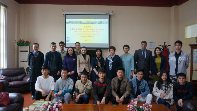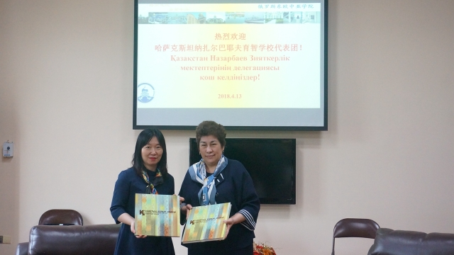 会谈之前哈萨克斯坦纳扎尔巴耶夫育智学校董事会主席沙姆希季诺娃·库利亚什一行先拜访了俄欧亚学院和哈萨克斯坦中心,与学院的师生和中心的老师亲切交谈并赠送了哈萨克斯坦音乐光盘集、诗歌集等。上外11名哈萨克语专业的学生表现了良好的专业素养,用哈语和客人们进行了交谈,并演唱了哈萨克斯坦传统歌曲《你承诺过会来的》及哈萨克斯坦著名诗人穆卡哈利·玛卡塔耶夫的“一生三幸”。沙姆希季诺娃·库利亚什女士对学生在短短的7个月时间内的哈语水平表示了赞赏。