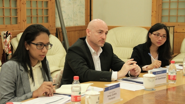 会谈中,杨校长向西班牙客人介绍了上外近年来人才培养、国际交流及国别区域研究等情况。他指出,目前两校合作顺利开展,互动频繁,本科生交流及3+1+1项目进展顺利并深受学生欢迎,下阶段双方合作的重点应着眼于合作广度、深度的开拓。双方就“本科2+2项目”的推进和暑期培训班实施进行了细致的商讨。