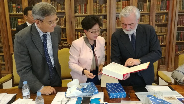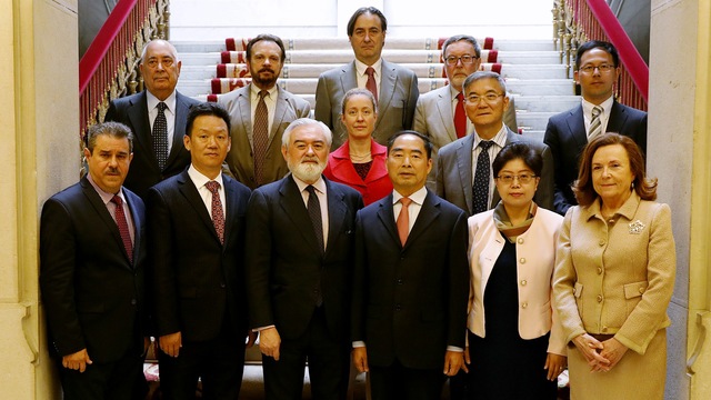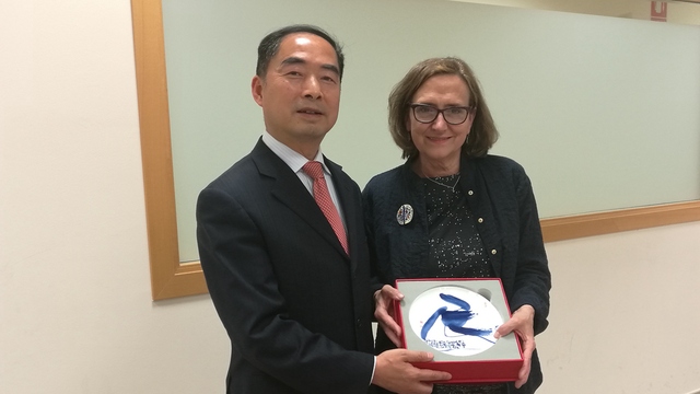 随后,代表团一行来到西班牙,先于6月1日访问了巴塞罗那自治大学,会见该校负责国际合作的协理副校长Maria Teresa Paramio及翻译学院院长Albert Branchadell Gallo等。双方就翻译专业学生交流、联合举办学术研讨会、合作编辑出版学术期刊专刊、中西学术精品互译、东亚研究等方面的合作事项进行了充分沟通,达成广泛共识。双方还同意进一步拓展合作交流的学科领域。