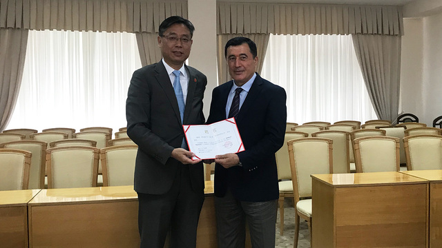 向乌兹别克总统战略与区域间研究所所长、上海合作组织候任秘书长Norov颁发上外荣誉教授证书