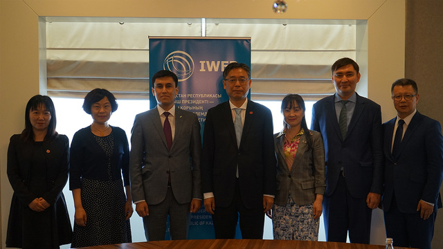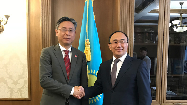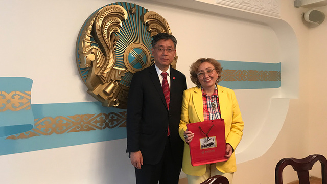 与哈萨克斯坦国际事务委员会主席、哈总统战略研究所前所长、哈国家广播电视集团董事长Karin会谈合影