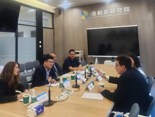 在语料库研究院,胡开宝介绍了语料库研究院在学科建设、学术研究、人才培养等方面的工作特色,重点展示了研究院在语言数据库和语料库建设等方面取得的成绩。