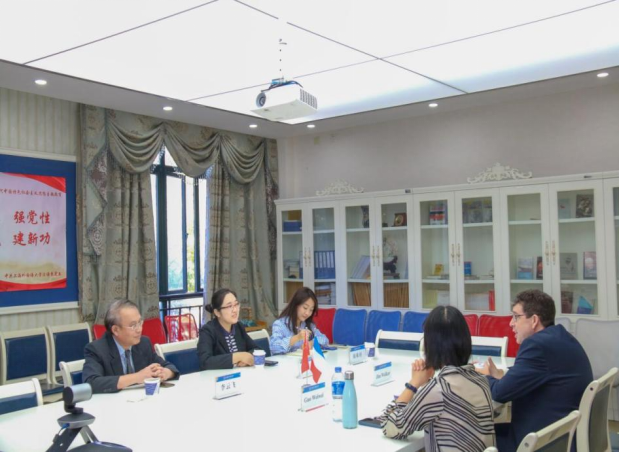吉姆·沃克一行首先来到法语系。王蓓丽向来宾表示欢迎,向里昂第二大学长期以来对上外法语系的支持表示感谢。今年两校续签国际合作框架协议和学生交换协议,期待未来能在人文学科和师生交流等领域有更多深入的合作。
