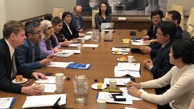 在多伦多大学访问期间,副校长Joe Wong带领全球事务与公共政策学院资深教授、全球G20研究专家John Kirton教授,艺术学院院长Michael Ratcliffe教授,中加研究中心主任Lisa Rose Mar, Richard Charles Lee等多个部门负责人与代表团进行会谈。李校长关于上外近年来建立和发展的上海全球治理与区域国别研究院、中阿改革发展研究中心、卓越学院和中国学项目的介绍,引起了对方浓厚的兴趣,双方约定将在中国学硕士项目、联合创办暑期项目、硕士双学位等方面开展合作。