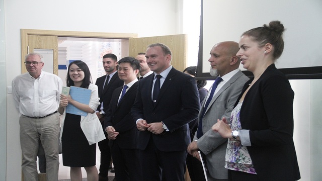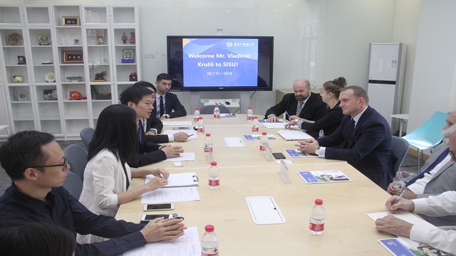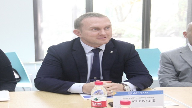 10月8日上午,由捷克共和国总统办公厅礼宾司司长弗拉基米尔·克鲁利什(Vladimír Kruliš)先生和捷克共和国驻上海领事馆总领事理理查德·卡尔帕奇(Richard Krpač)先生率领的捷克总统办公室与捷克驻沪领馆联合代表团一行共九人到访上外松江校区,上外副校长张峰在松江校区国际教育中心热情接待了捷方代表团一行。
