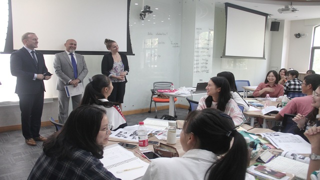 之后,捷方代表团一行来到捷克语班教室与同学们进行亲切的会谈和互动。司长先生鼓励同学们努力学习,充分利用将来赴捷游学深造的机会,成为推动中捷两国交往和传播中捷文化的使者。临行前,捷克代表团还在我方人员的陪同下参观了松江校区,整洁美丽的校园给代表团留下了深刻的印象。