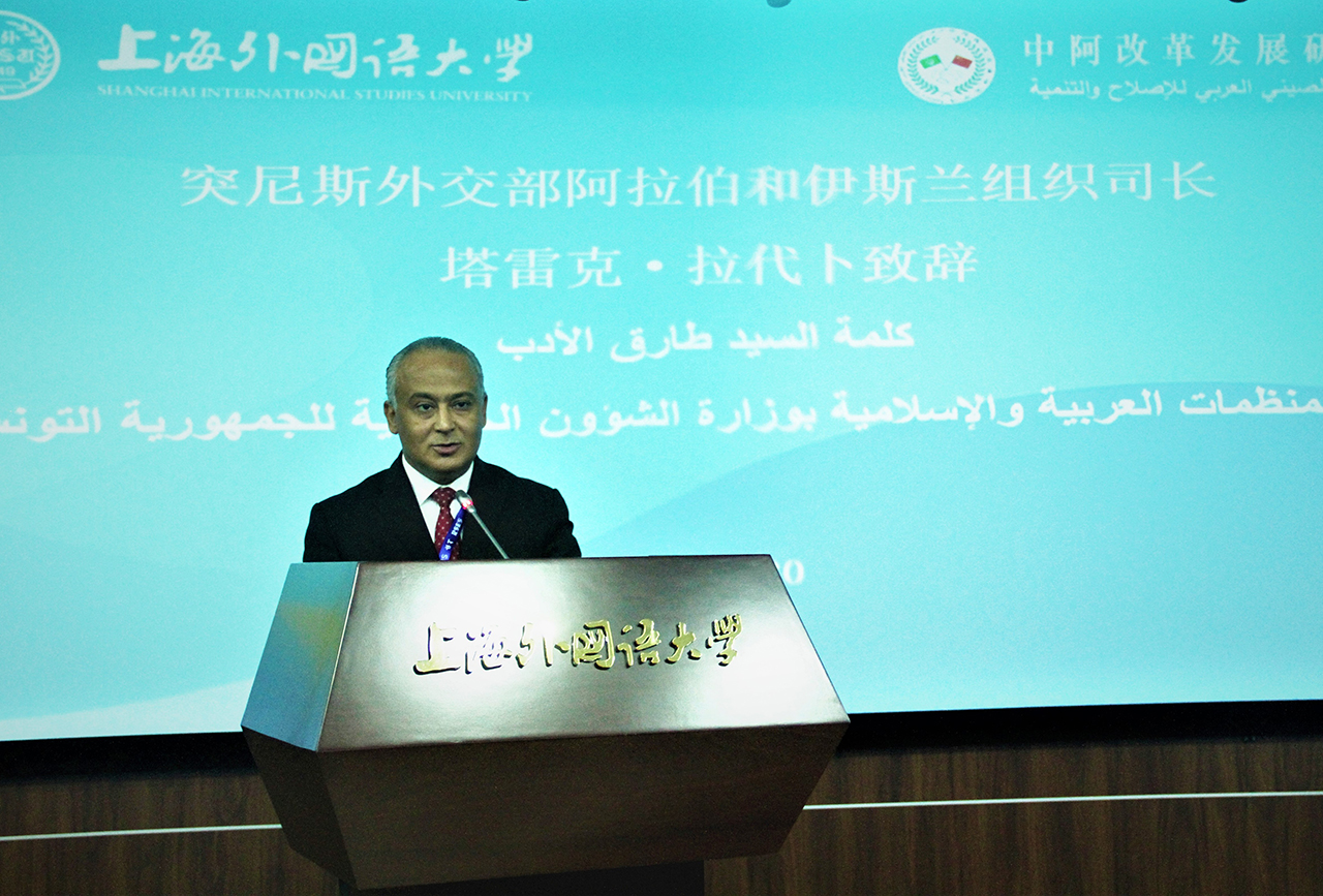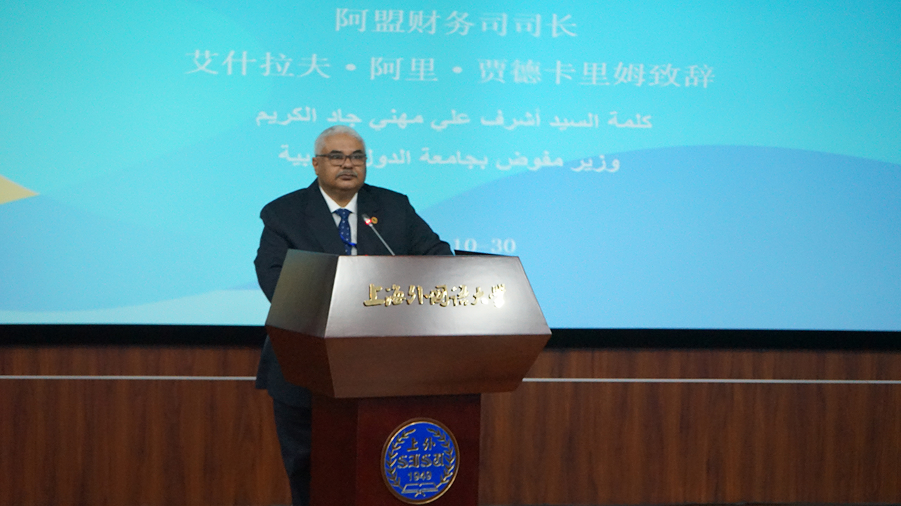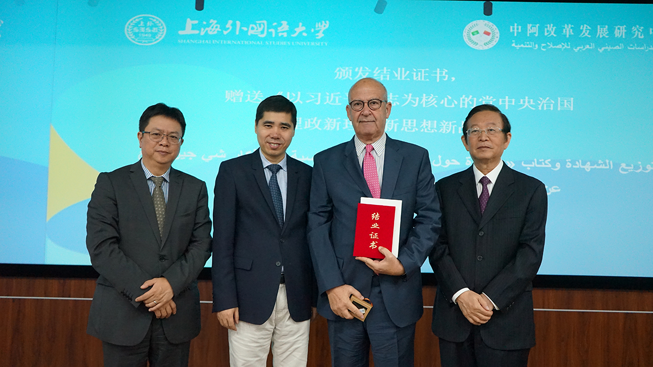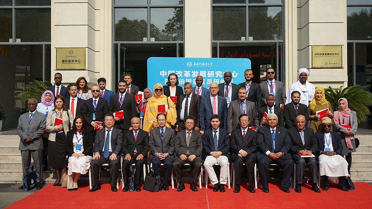 2018年10月30日上午,由外交部、教育部和上海市人民政府共同主办,上海外国语大学承办的中阿改革发展研究中心(以下简称“中心”)第五期阿拉伯国家官员研修班结业仪式在上海外国语大学松江校区国际教育中心举行。上海外国语大学校长李岩松教授、外交部西亚北非司副司长王镝大使、外交部中阿合作论坛事务大使李成文先生、外交部亚非司论坛办和多边事务处处长简放宁参赞等出席结业仪式。李岩松校长与王镝副司长分别致辞。阿盟财务司司长艾什拉夫·阿里·贾德卡里姆、突尼斯外交部阿拉伯和伊斯兰组织司长塔雷克•拉代卜分别代表阿盟和学员发言。结业仪式由中心理事会秘书长、执行主任王广大教授主持。