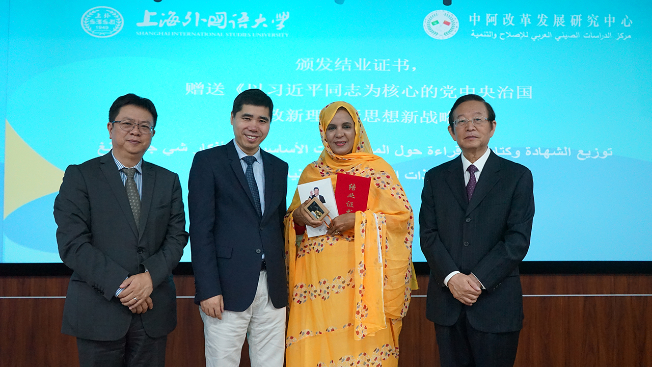 之后,王镝副司长、李成文大使、李岩松校长向学员颁发结业证书、赠送《以习近平同志为核心的党中央治国理政新理念新思想新战略》(阿文版)和纪念品。