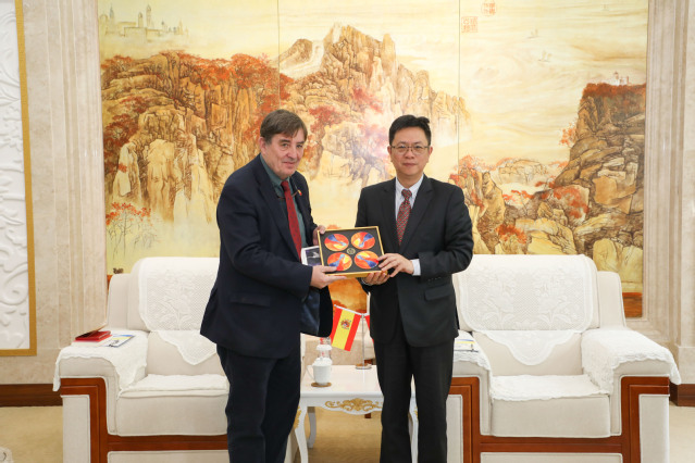 李岩松对蒙特罗一行表示热烈欢迎,并详细介绍了我校西班牙语专业近年来在学科建设和人才培养方面取得的。李岩松指出,我校与西班牙多所知名高校建立了紧密的合作关系,特别是与西班牙皇家学院共同设立的联合研究中心,已成功举办一系列重要的教育、文化和学术交流活动,为中西两国的文化交流做出了积极贡献。他表示学校高度重视与塞万提斯学院的合作,期待未来进一步加强在西班牙语教学、研究以及文化交流等方面的合作,共同推动中西文化的交流与互鉴。