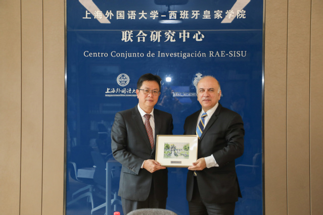 4月29日,乌拉圭驻沪总领事马龙(Marcelo Magnou)先生一行访问上外松江校区,校长李岩松在上海外国语大学—西班牙皇家学院联合研究中心会见外宾。