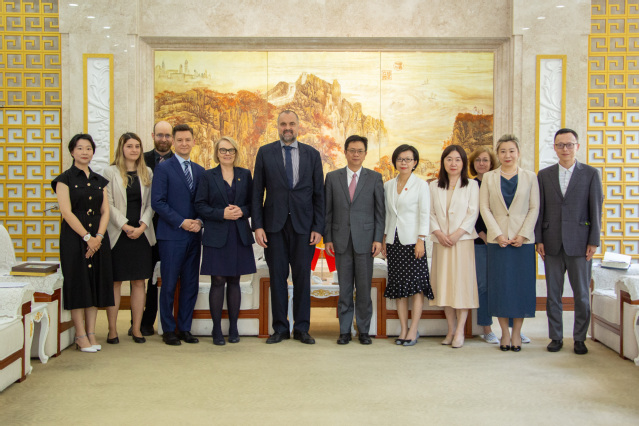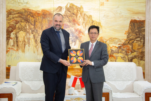 2024年5月10日,波兰驻华大使古天卫(Jakub Kumoch)、波兰驻沪总领事玛格达莱娜·朱可夫斯卡(Magdalena Żukowska)一行访问上海外国语大学,校长李岩松在松江校区会见来宾。