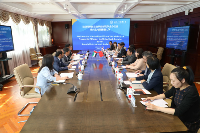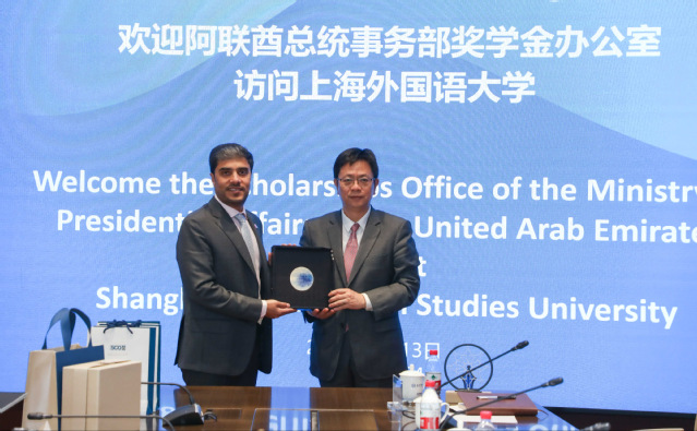 5 月13日,阿联酋总统事务部奖学金办公室主任朱玛·鲁迈西(Juma Alremeithi)一行访问上海外国语大学,李岩松校长在虹口校区会见来宾。
