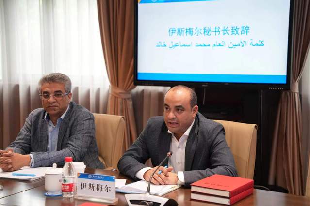 李岩松校长祝贺伊斯梅尔博士就任秘书长,介绍了学校在中埃、中阿文明互鉴与合作交流方面的相关情况,展示了学校办学特色、学科建设以及教育对外开放成果,着重讲述了上外希望通过发挥语言学科优势,结合考古、历史、艺术与人文交流,增进国别区域全球知识领域建设的布局与举措,表达了愿意与埃及各方增进文明互鉴与交流的设想。李校长阐述了学校对促进中埃之间学术研究和人才培养交流方面的全力支持,诚挚邀请伊斯梅尔秘书长参与学校75周年校庆相关活动。