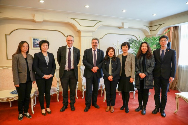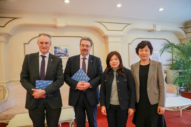 4月11日上午,英国莱斯特大学科研副校长Iain Gillespie教授和外事协理副校长Paul van Gardingen教授到访上海外国语大学虹口校区。党委副书记钱玲在会议中心热情接待了来访客人。