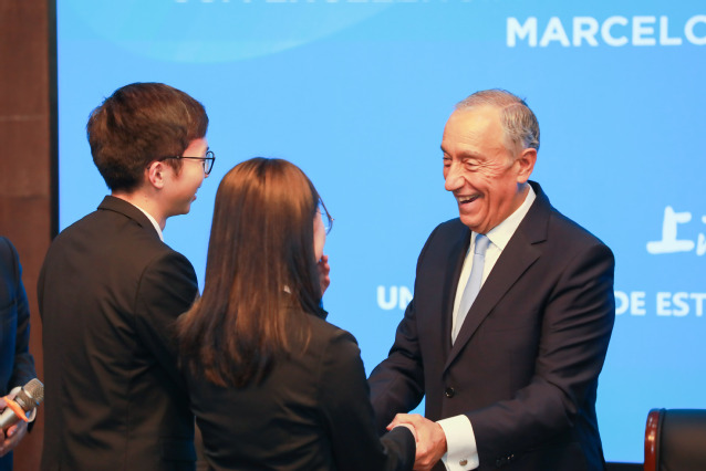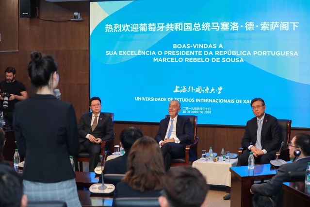 随后,德·索萨总统在会议中心第二报告厅与葡萄牙语专业师生进行了亲切交流。李岩松校长主持交流活动,他代表上外师生热烈欢迎总统阁下访问上外,他提到,在2018年12月初中国国家主席习近平访问葡萄牙之际,在葡萄牙《新闻日报》发表的署名文章中提到过一对在葡萄牙克服疾病苦难、数十年如一日教授中文、传播中华文化的教师鲁晏宾、王锁瑛夫妇,而这对老夫妇正是上外葡萄牙语专业的创始人。