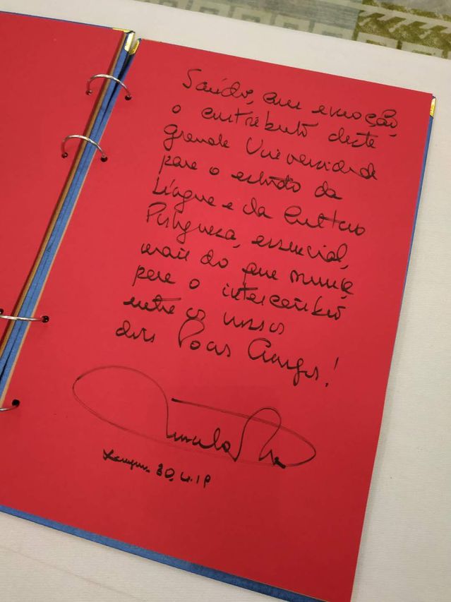 会谈中,德·索萨总统为上外70周年校庆题贺词并录制70周年校庆祝福。他在贺词中提到:我非常感动于上外这所优秀的大学为葡萄牙语言文化所做出的贡献,这对于两个友好民族之间的交流具有前所未有的重要性。姜锋书记代表上外向德·索萨总统赠送了由上海外语教育出版社出版的汉外对照版四大名著之一《三国演义》。
