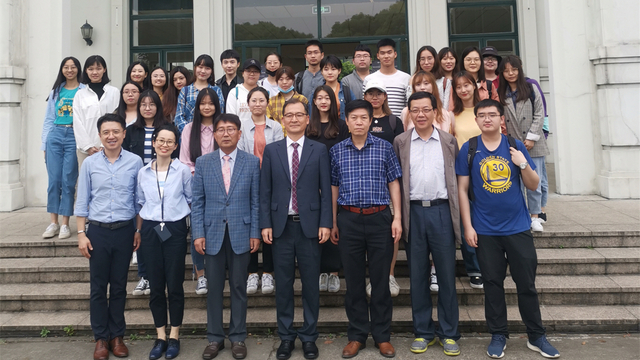 东方语学院副院长高陆洋致辞,对文泰烈领事的到访表示感谢,介绍了上外东方语学院及朝鲜语专业的情况。文泰烈领事系统地介绍了韩国的教育制度和终身教育文化,并并深度分析了当代韩国社会老龄化问题的严重性以及终身学习的必要性等问题。此外,他还精心设计了韩国熟语有奖翻译等互动环节,同学们积极参与其中,气氛十分热烈。东方语学院副院长高陆洋和朝鲜语系副主任李钟洙分别为文泰烈领事送上了感谢牌和纪念品,师生们合影留念,为此次交流活动画上了圆满的句号。