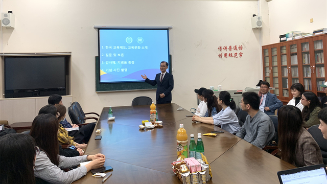 5月16日, 韩国驻上海总领馆的文泰烈教育领事应邀到访上外东方语学院,与朝鲜语专业师生开展文化交流活动。