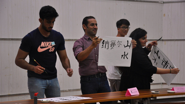 在阿语交流的同时,同学们也不忘向来宾们展示中华传统文化,以吉他和马头琴改编的二重奏《安河桥》为客人带来了具有中国传统特色的优美旋律。主持人更邀请科威特友人上台尝试中国书法,教他们书写了“山、川、日、田、月”几个基本汉字,并写下“中阿友谊地久天长”的横幅,表达了中国与阿拉伯国家愿携手共同发展的深厚情谊。