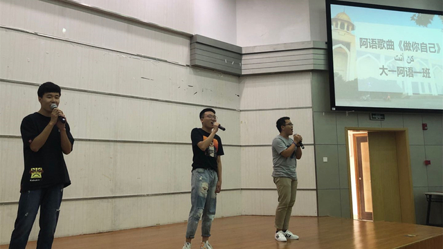 第一个节目由来自大一的三位男生倾情演绎,一曲充满动感活力的阿语歌曲《做你自己》,瞬间点燃了现场气氛。尽管只学习了一年阿语,但三位同学自信的表演和标准的发音让台下的科威特青年们击节赞叹,随歌摇摆。之后大一、大二的学生分别展示了他们根据课文改编的精彩小品《小毛驴找妈妈》和《后来的我们》,准确而幽默的语言加上学生投入到位的表演引得观众阵阵笑声。大二的三位学生随后带来了激情澎湃的阿语诗歌朗诵,饱满的情绪引起了来宾们的共鸣。而一曲悠扬深情的科威特流行歌曲《改变你眼眸的颜色》不仅彰显了学生对阿拉伯音乐的热爱,也令在场的科威特青年倍感亲切,掌声不断。