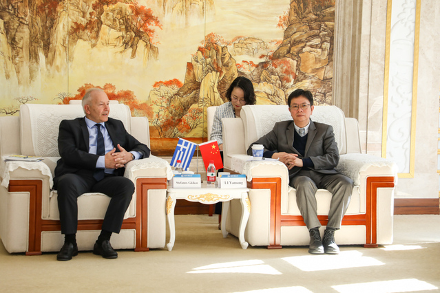 11月29日上午,希腊海洋事务与岛屿政策部副部长斯特凡诺斯·吉卡斯(Stefanos Gkikas)一行在希腊驻沪总领事乔治·帕特纽(Georgios Partheniou)的陪同下访问上海外国语大学,校长李岩松在松江校区会见来宾。