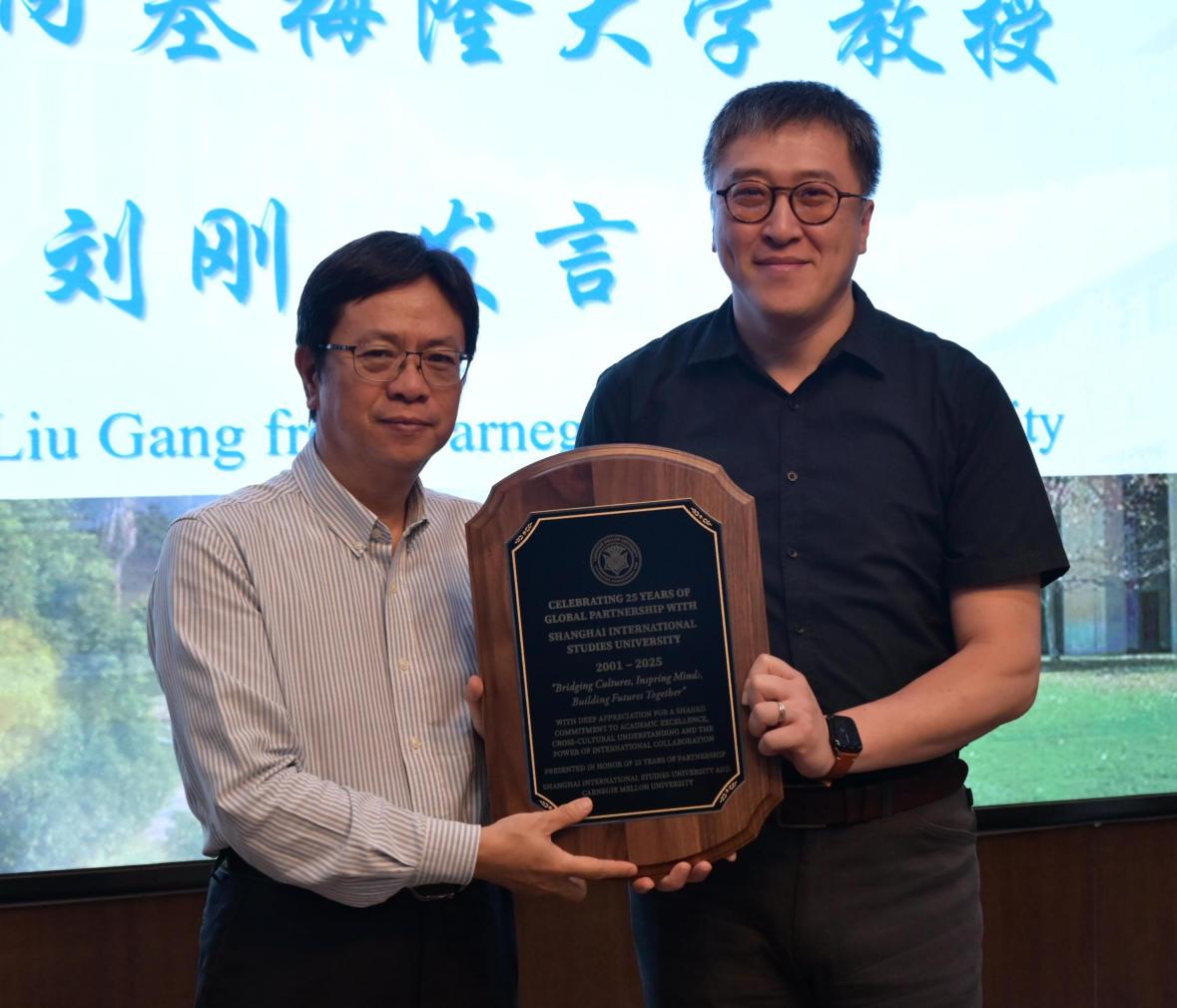 接下来,美国卡内基梅隆大学语言、文化和应用语言学系本科生教务主任刘刚教授代表美方向上海外国语大学校长李岩松赠送了一块镌刻着两校合作印记的纪念牌。刘刚在随后的发言中指出,正是因为两校在学术合作中高度的默契与共识,项目的课程内涵才能不断突破,始终保持蓬勃的生机。他期待,两校合作的深度与广度持续拓展,为更大范围的学分互认和校际交换搭建交流平台。