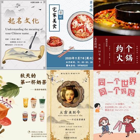 线上重相遇,共结汉语情。2020年11月,国际文化交流学院成功在线上举办秋季汉语角活动。截至11月12日,2020级汉语国际教育专业硕士生共有8个小组开展了活动,吸引了来自世界各地多位留学生的参与。